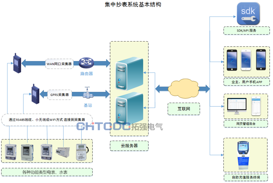 本係(xì)統由水電表,雲服務器,數據采集器,手機APP,網頁後台,自助充值終端等組成